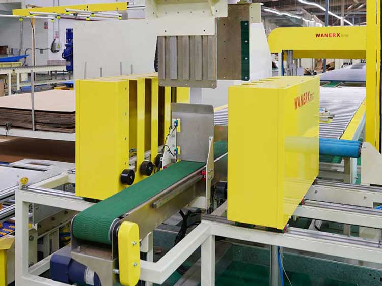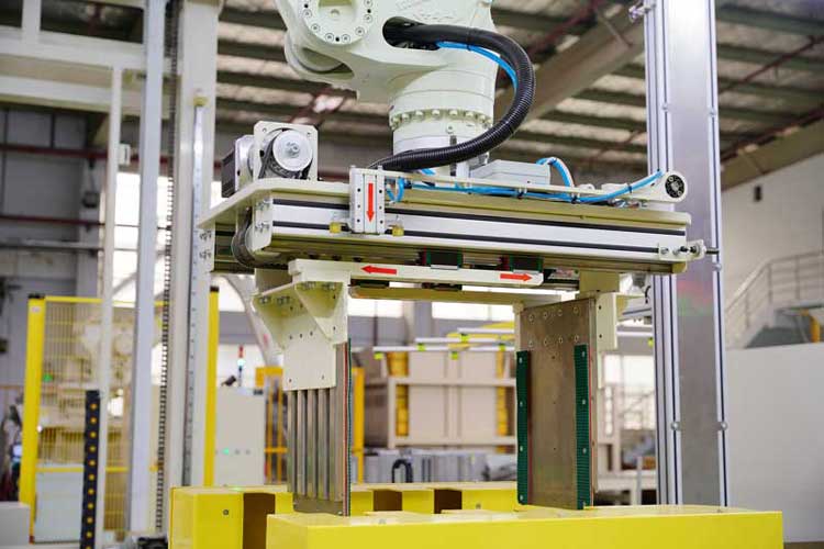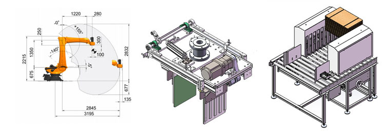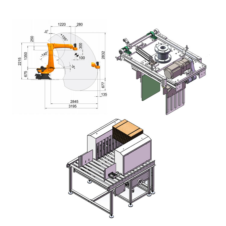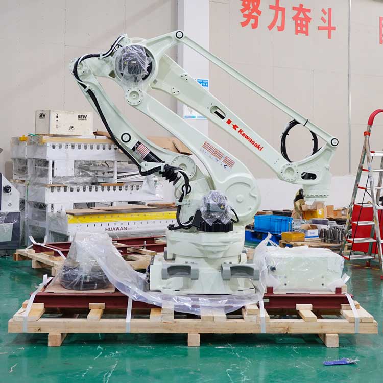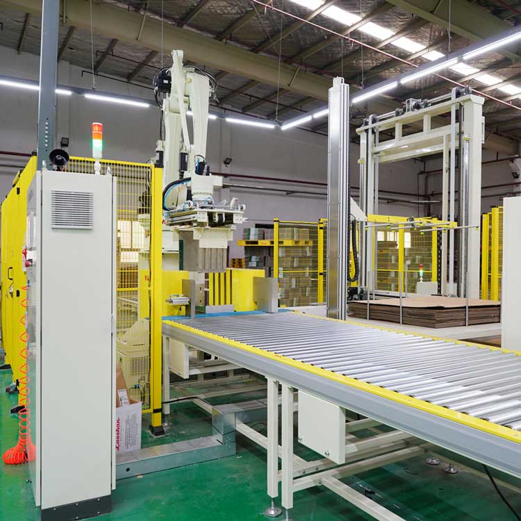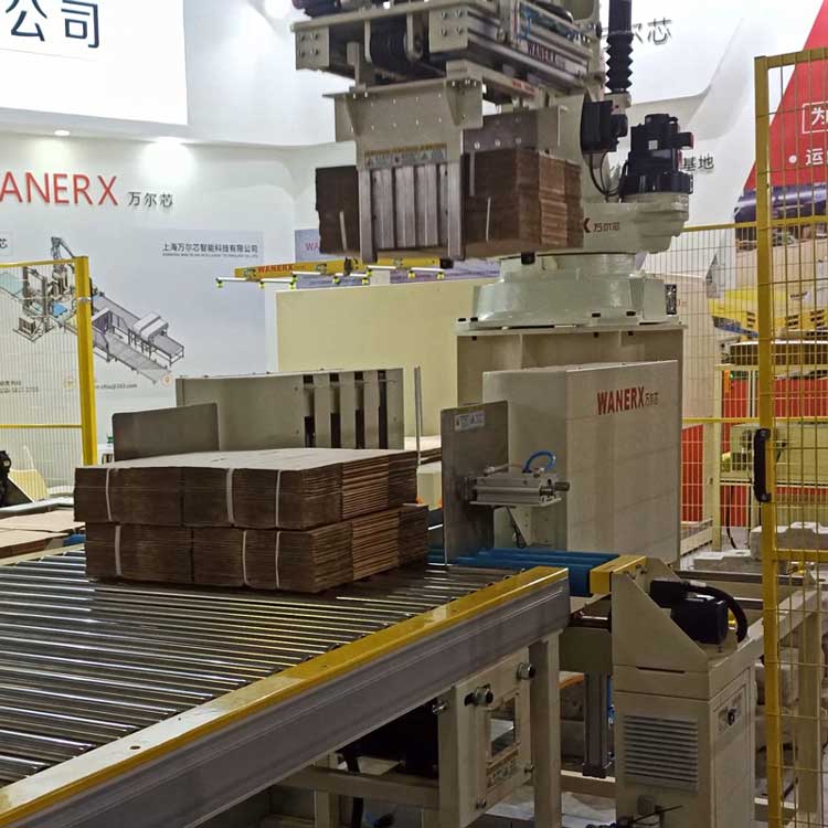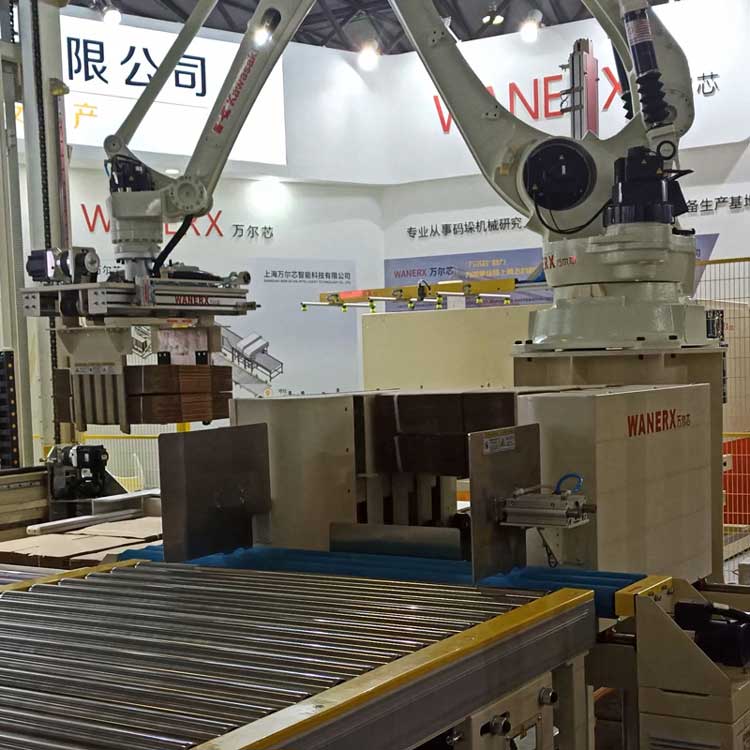 顶升抓取机构带有置中、叠包功能,可配合前叠包平衡国产麻豆精品久久效率;专业设计的纸板夹具带有防止了脱钩,可有利夹取放置一层或两层纸箱防掉落;机器人采用四轴式Kawasaki机械手臂兼顾性能与成本,将纸箱按自定义的垛型自动码放到托盘上。