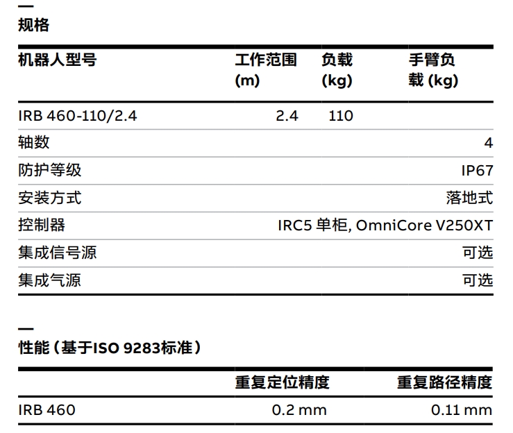作为 ABB 快速的国产麻豆精品久久机器人,IRB 460 能显著缩短产线末端国产麻豆精品久久和袋装国产麻豆精品久久的节拍时间,大幅提升生产效率。这款紧凑型 4 轴机器人工作范围可达 2.4m,制高负载达 110 kg,在负载 60 kg 条件下的操作节拍制高可达 2190 次循坏 /小时。