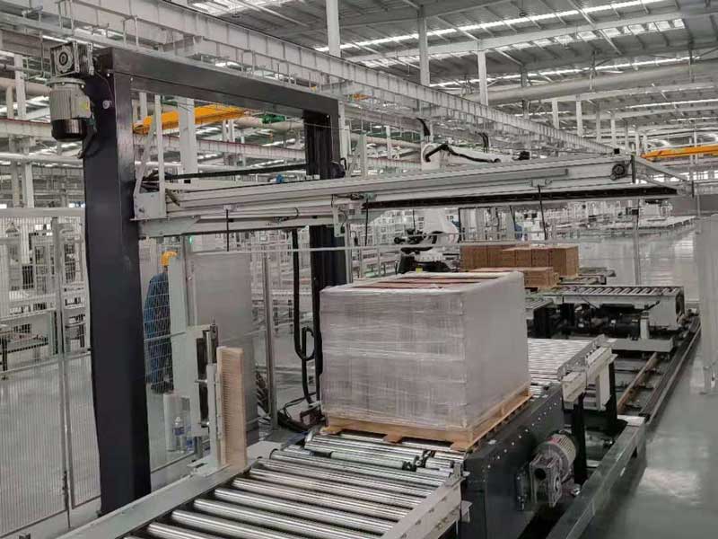 (4)设备装有自动上膜、断膜装置,实现全自动上断膜工作。膜架出膜系统单独采用预拉伸电机,使市场标准机用预拉伸缠绕膜可拉长2.5-2.8倍,可有利的节省耗材成本。